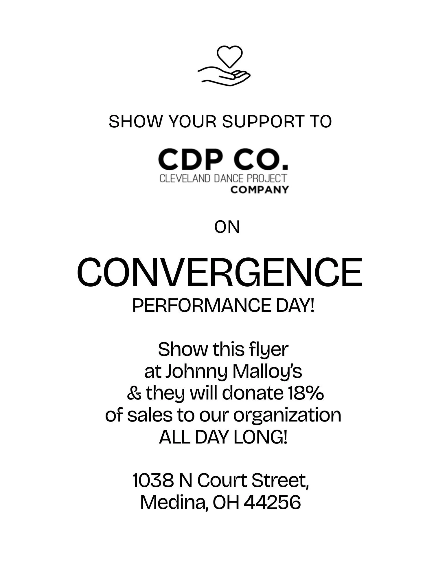 We’re having our CONVERGENCE Afterparty at Johnny Malloy’s in Medina on Saturday June 27 - join us after the show to celebrate (around 5:30pm)! Food & drink will be available for purchase AND 18% of all sales goes back to CDP Company!